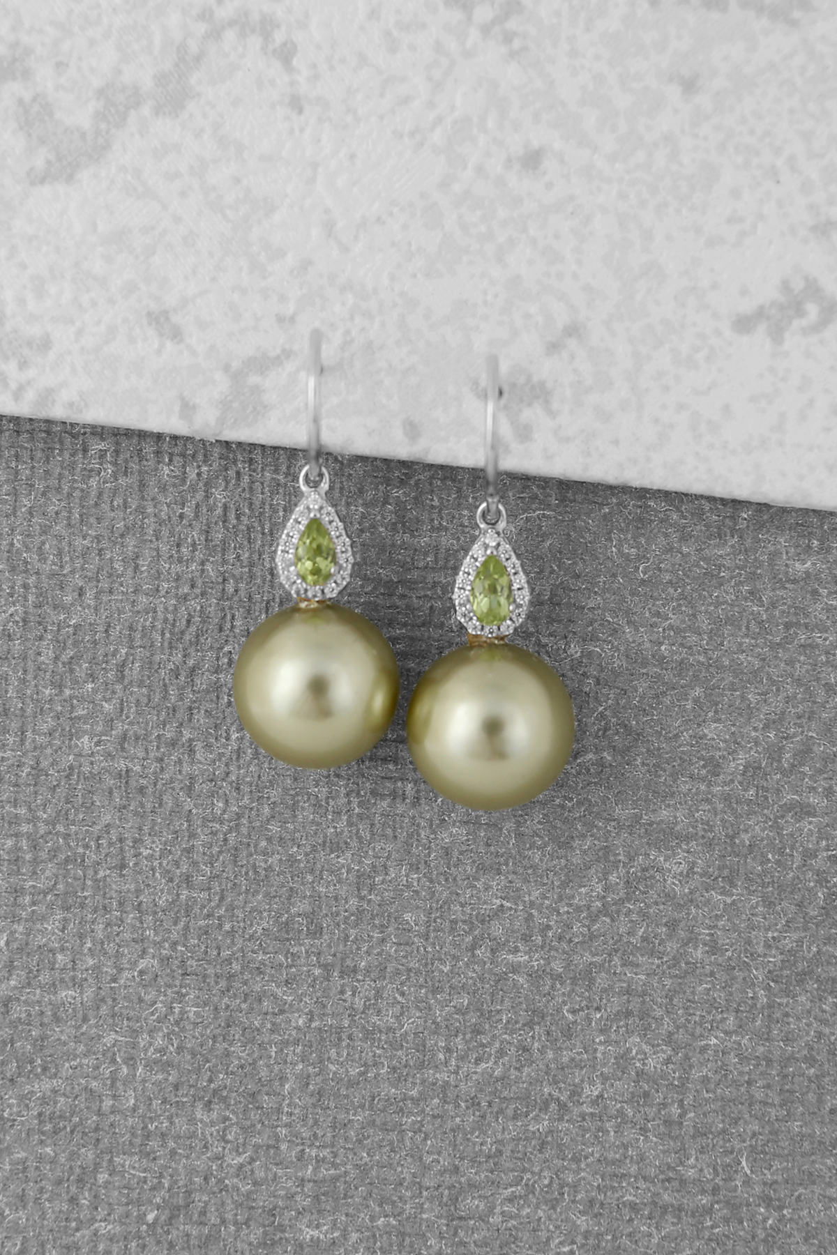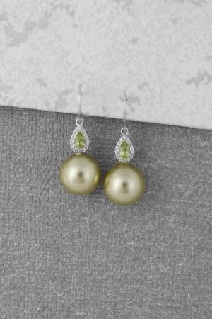 Sterling silver fish hook earring with cz-surrounded teardrop peridot and AAA quality southern sea color shell pearl drop perfects this jewelry pair tempting and being a great match for dresses or suits.