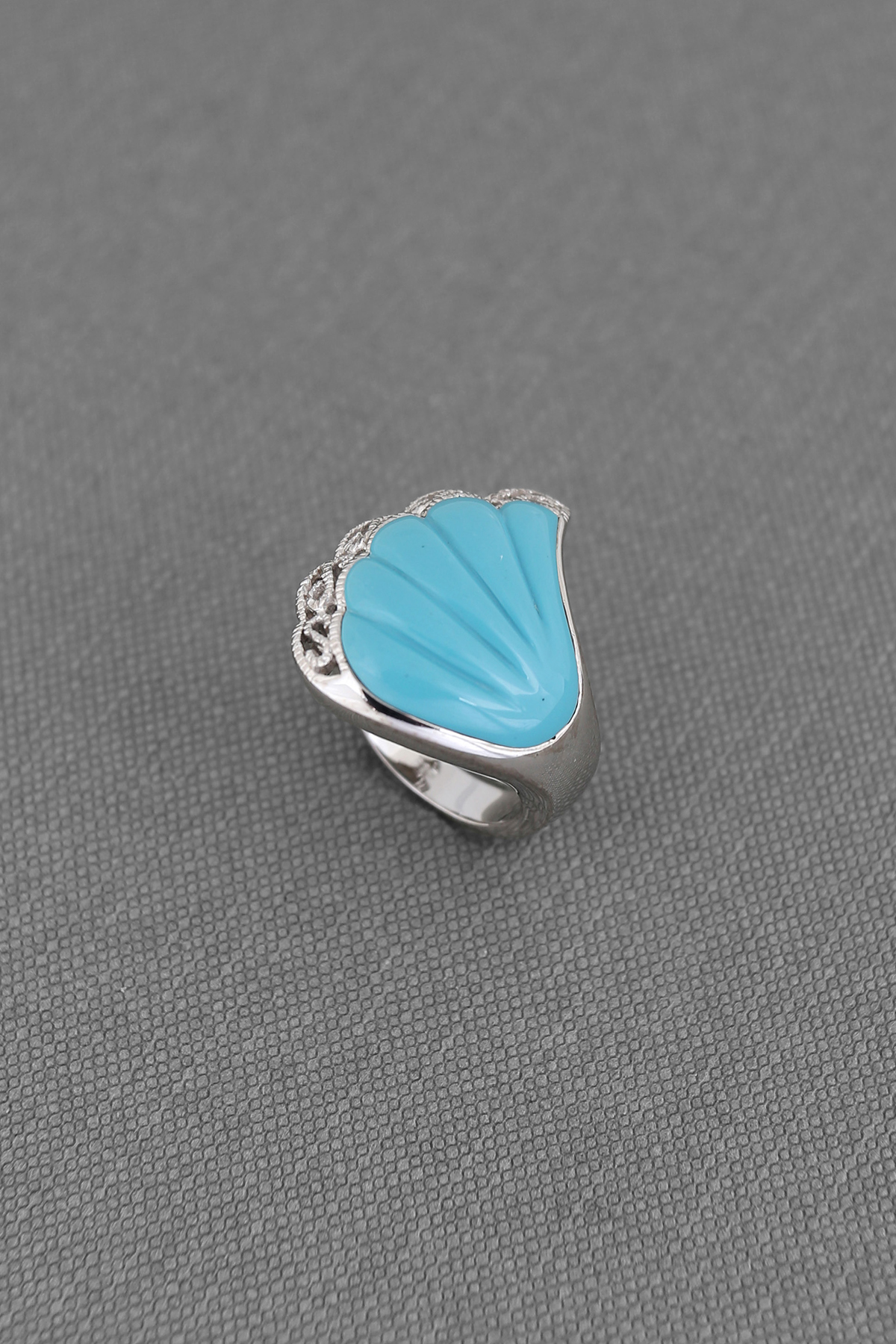 Scallop shell designed large silver ring framed by clear cubic zirconias makes it unique and exquisite.