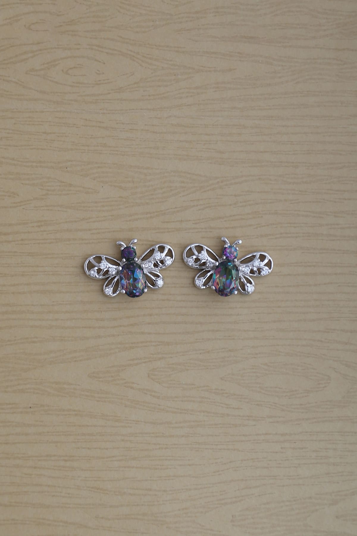 Designed honey bee Rainbow Topaz pierced stud earring in 925 silver, main stones sized 5x7m oval / 4mm round with outframed clear zircons to enrich the glamour of this cute earring pair. Item size : 18x12 mm.