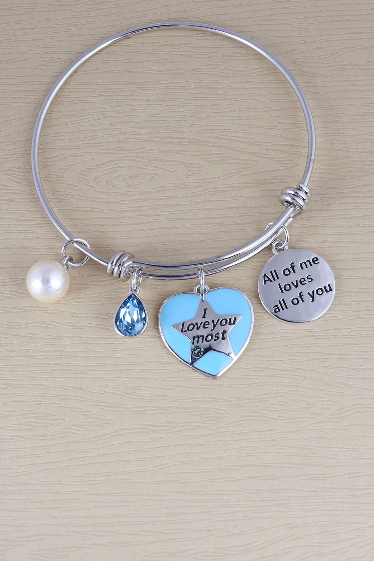 Heart design 8 : Love you most. Thank you for accompanying me all the way and bringing happiness through it. Matched charms are white shell bead, oxidized word disc and blue topaz Swarovski crystal. This bracelet is designed to be delicate, firm, durable and well-enameled, So with proper jewelry care you can wear for pretty long time.