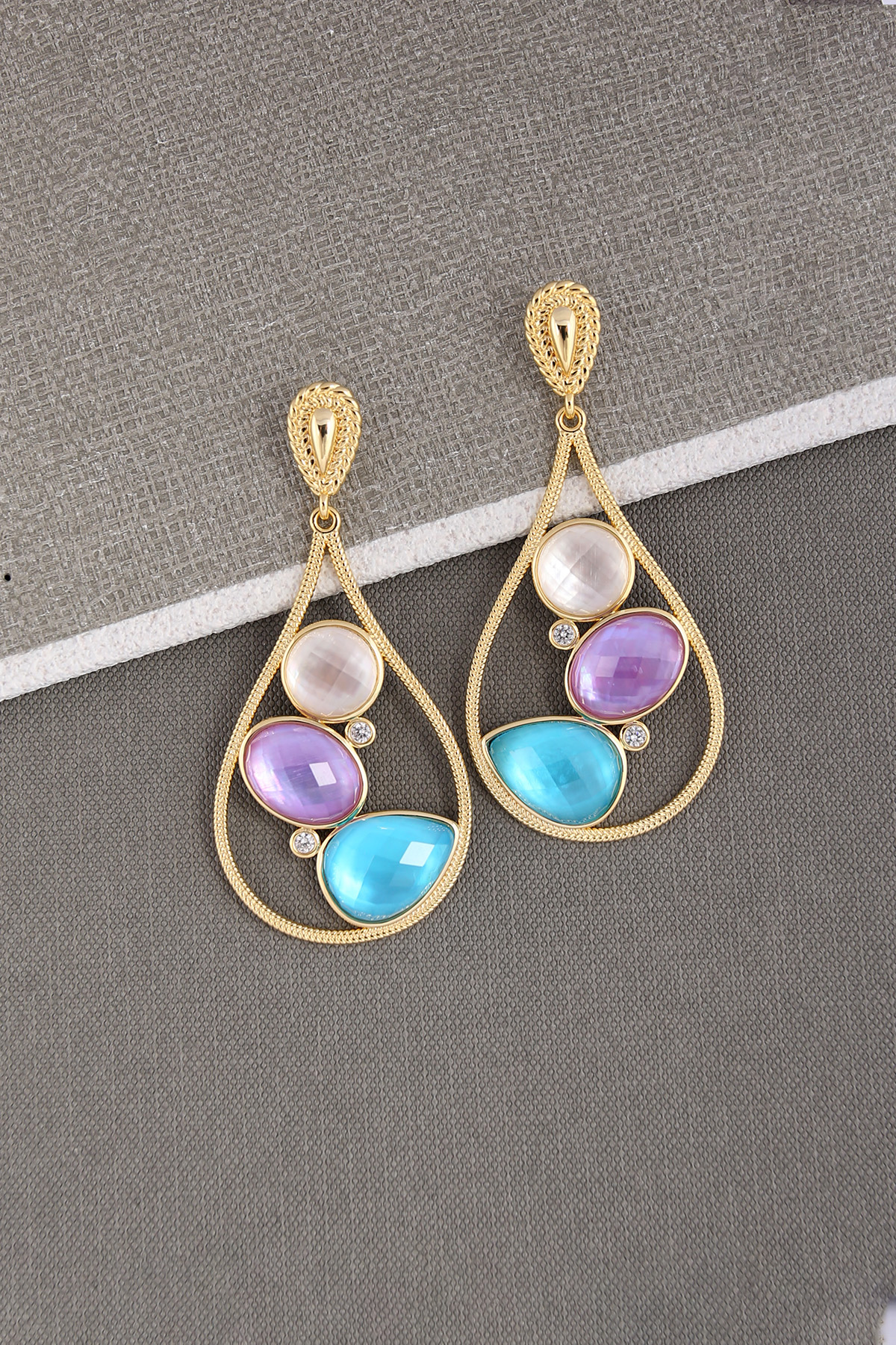 A super big water drop open dangle earring embellished with multiple color radiant-cut glass gemstone cabochones in the center of the pair casts impressive beauty and elegance through its glittering glamour and delicated design. With proper care this jewelry pair will bring you a timeless life.