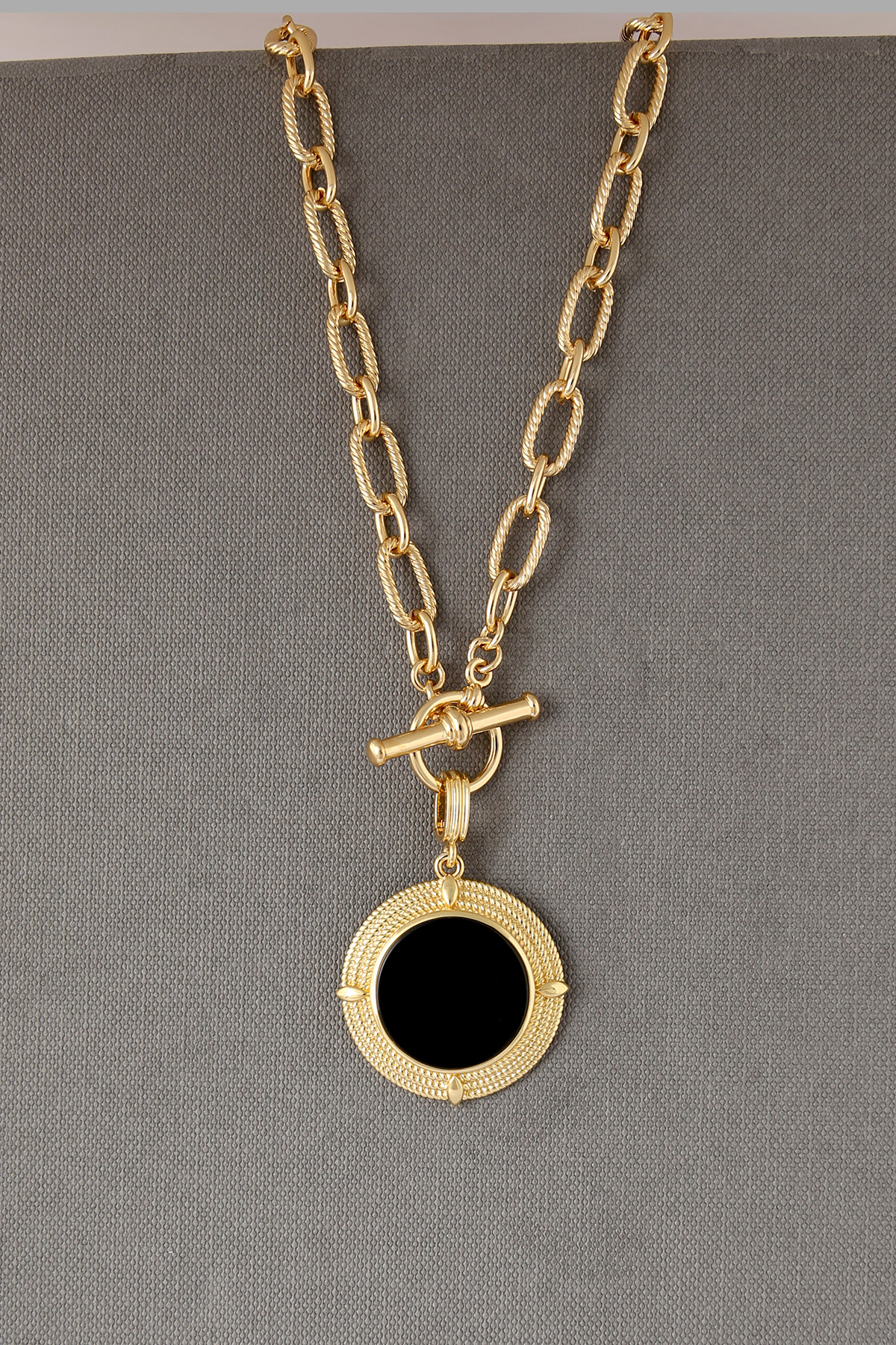 Elaborated triplilet rope framed design on solid stud and dangle round drop encrusted a black onyx plain-cut stone centerpiece creates this graceful jewelry pair having both elements of classical and modern. Dischargeable pendant bail can be taken off easily to go with other metal chains or pearl necklace. Matched pendant # K-3-001-BK with paper-clip adjustable chain 18-20 inches