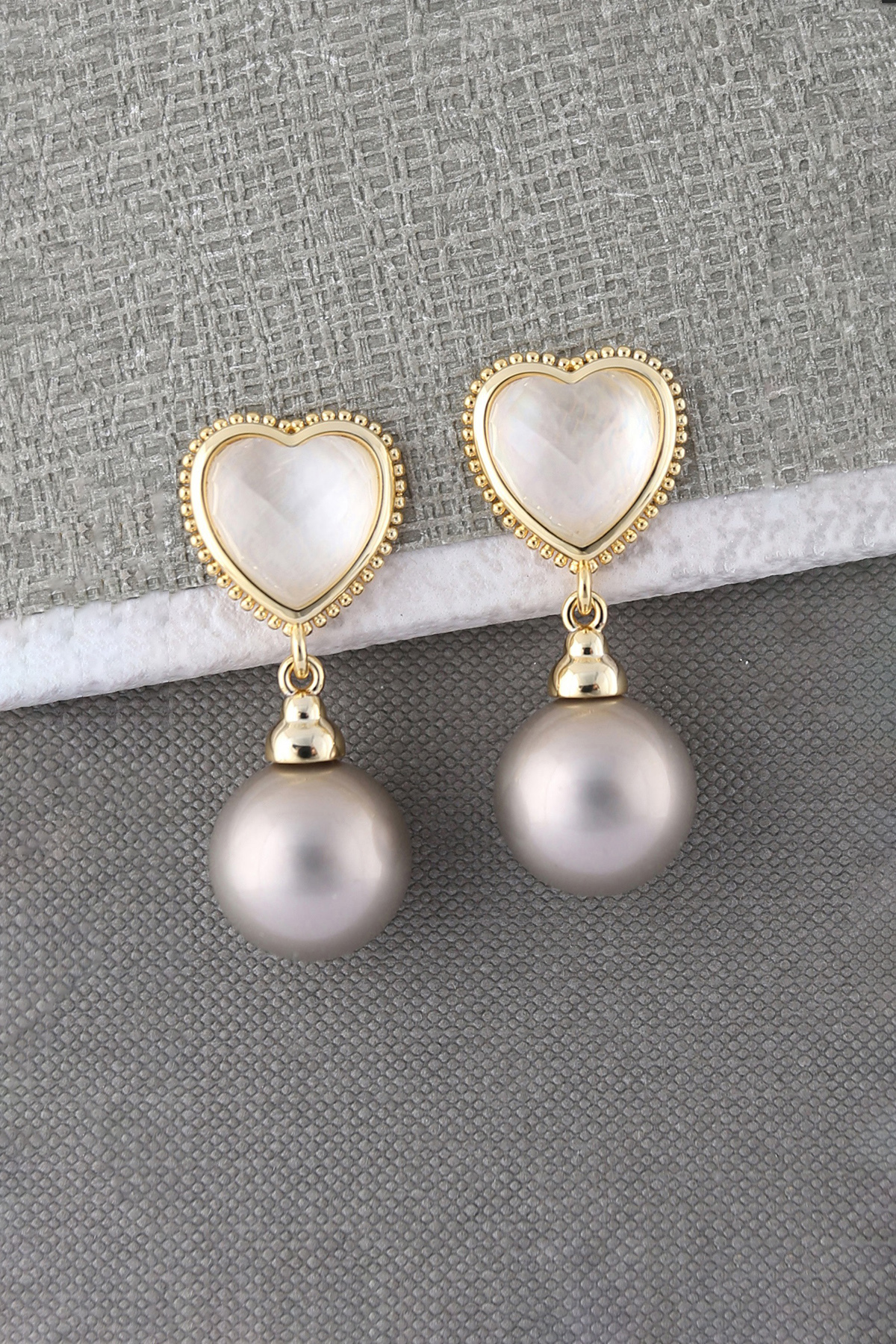 Exquisite earring of color shell pearl beadrop linking with a raise-framed white mother of pearl stone heart stud casts you a dazzling and tempting outlook whatever you are in casual outfits or dress up. This is a firm, durable and delicated jewelry pair for your long wearing.