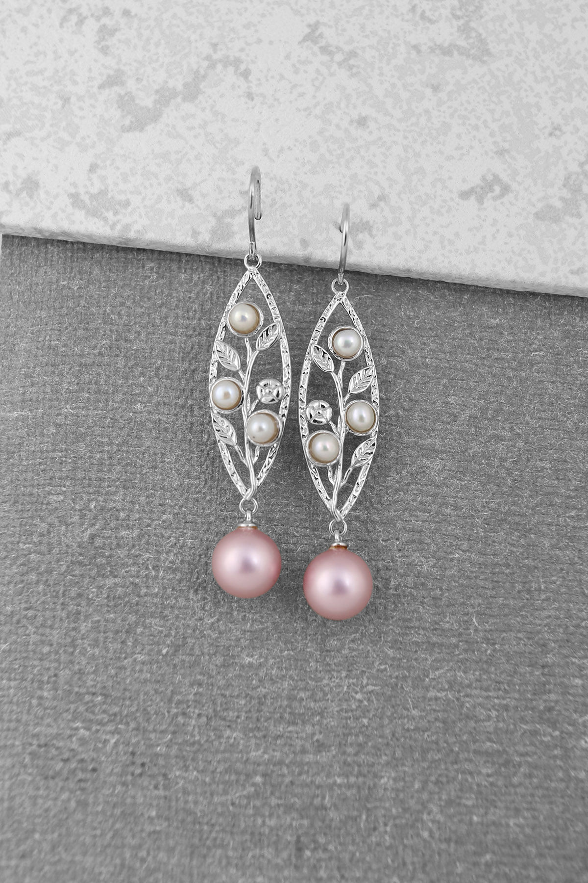 The filigree design faux South Sea shell pearls pair is made of 925 sterling silver, with the brilliance of pearl itself and scattered round fresh water pearls, will cast a glamour of feminine look at any time.