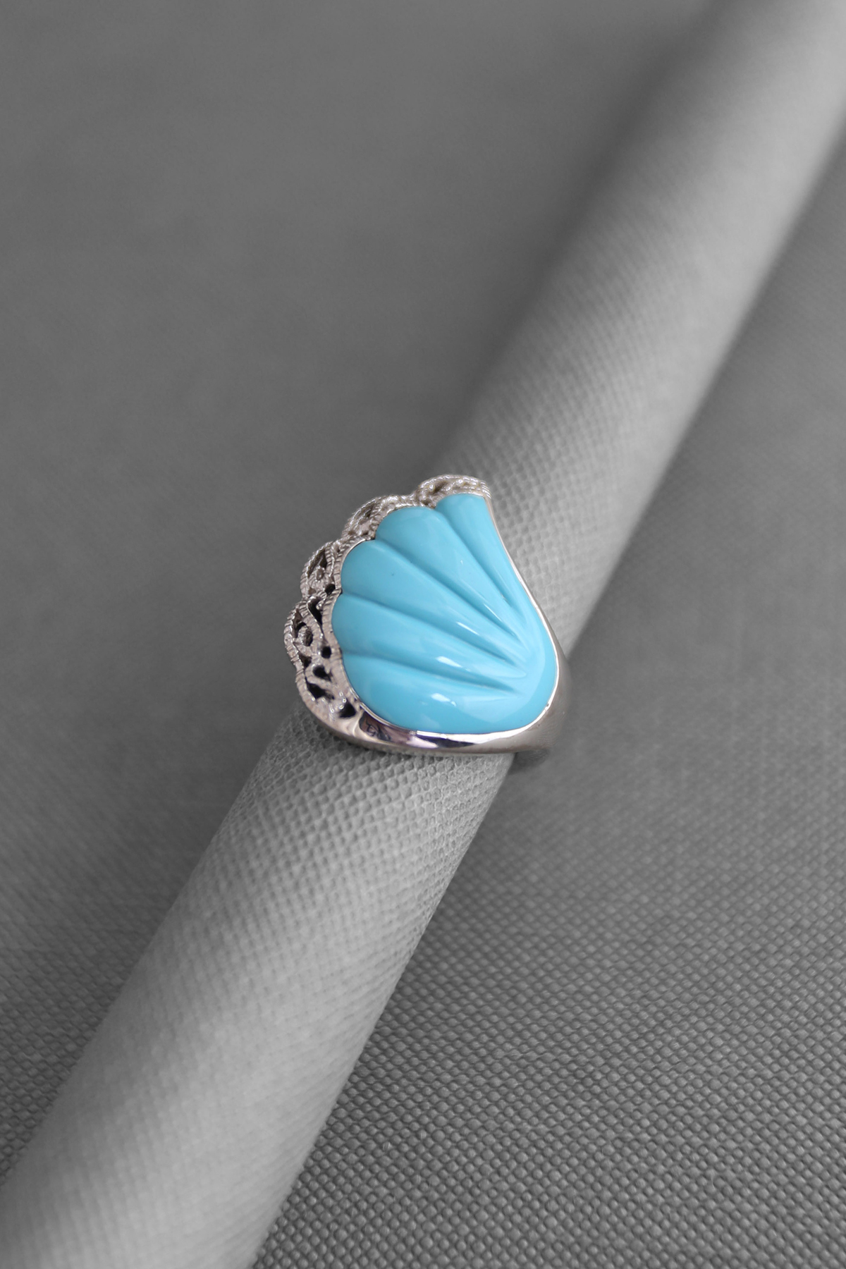 Scallop shell designed large silver ring framed by clear cubic zirconias makes it unique and exquisite.