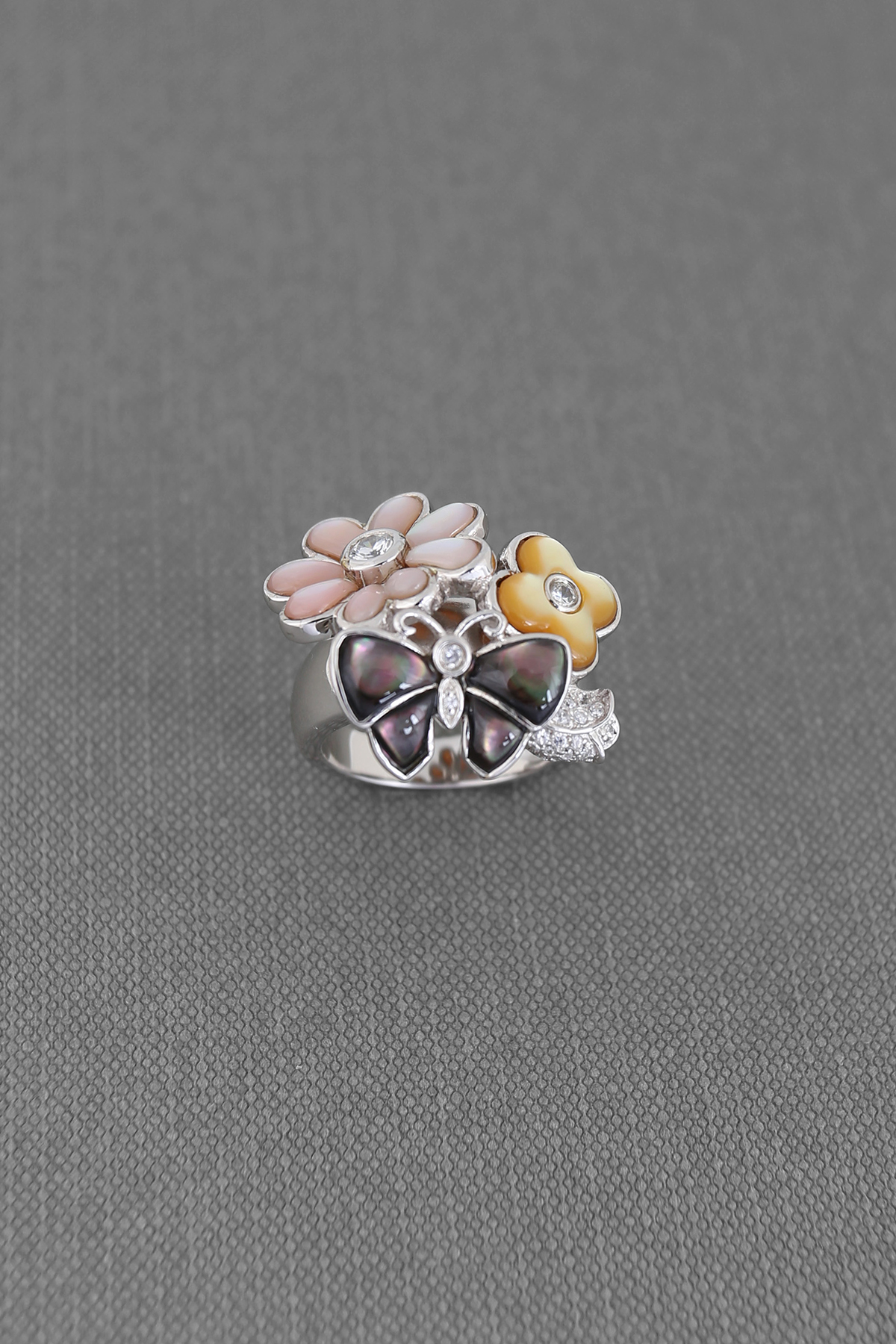 Exquisite siver ring in garden design, fully hand made piece, inlaid with different genuine color stones.