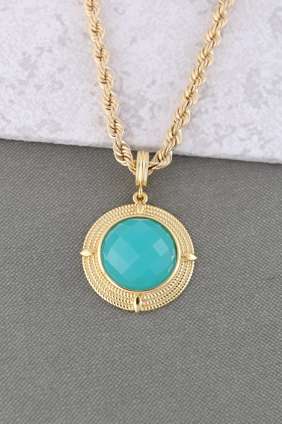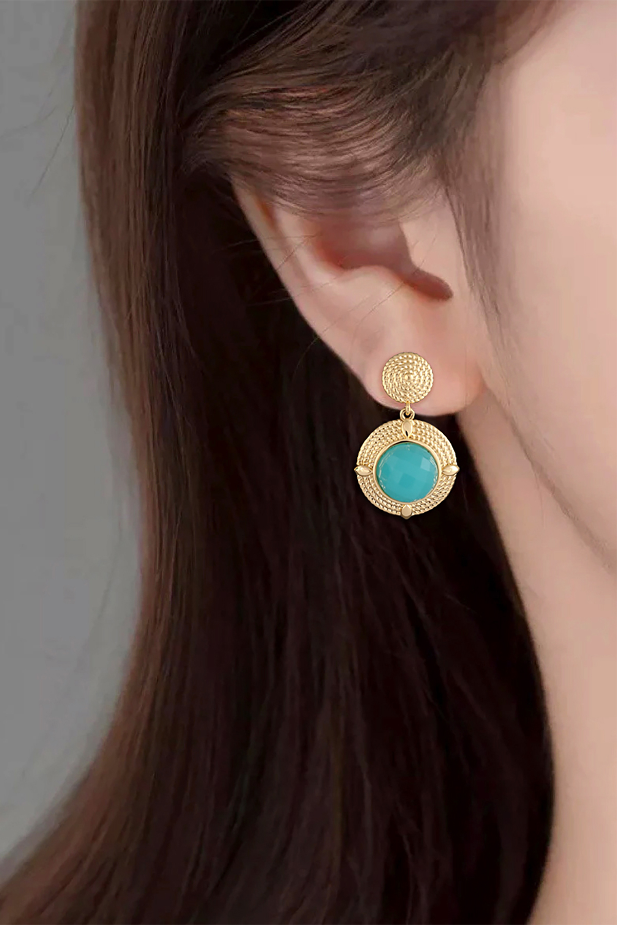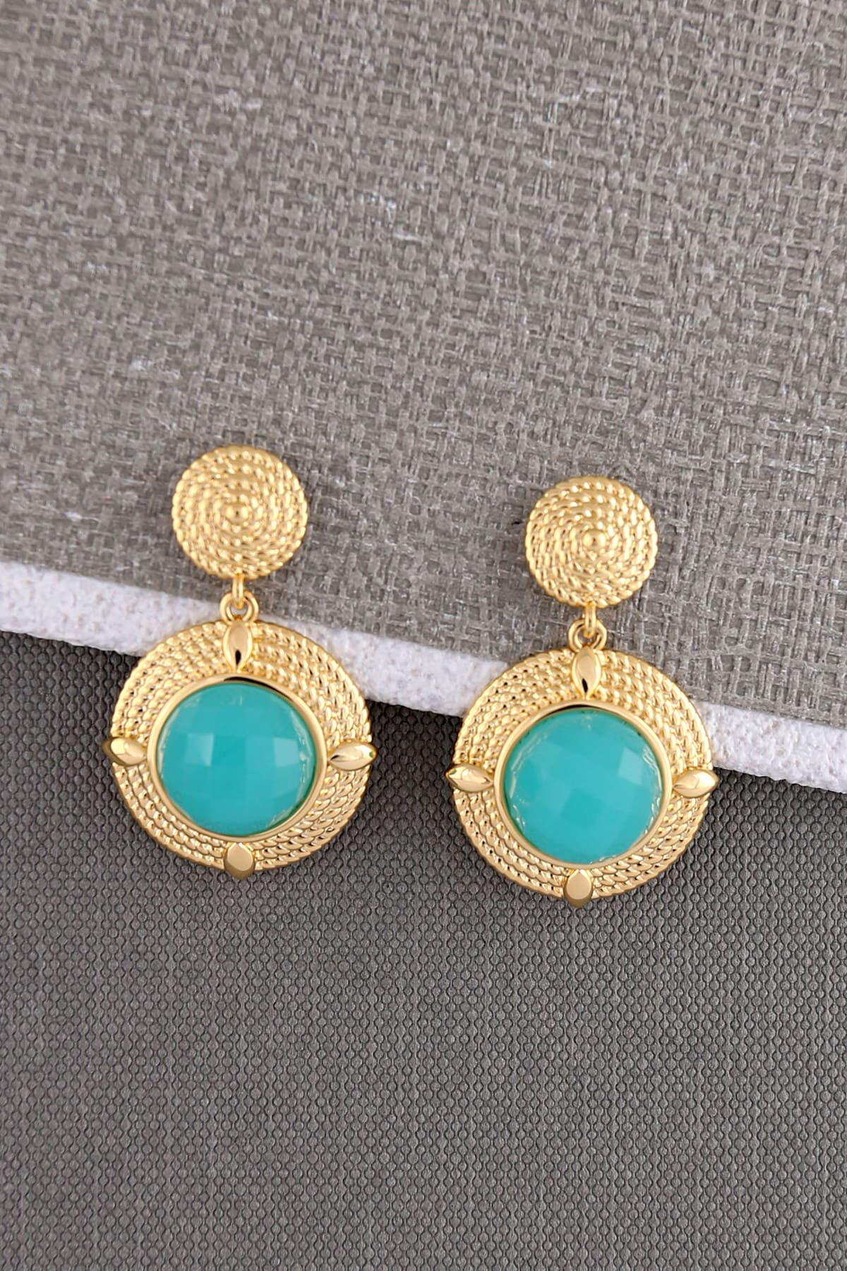 Elaborated triplet rope framed design on solid stud and dangle round drop encrusted a turquoise green faceted glass gem centerpiece creates this graceful jewelry pair having both elements of classical and modern. Matched pendant # K-3-001-TG.